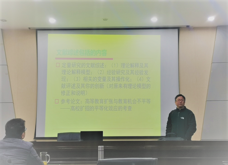 潘泽泉老师从研究选题到论文写作规范等多个角度进行了细致的讲解。在第一步论文选题的讲解中,潘老师强调希望各位同学做“基于理论的实证研究”,不能写成调查报告,而且选题必须具有问题意识。潘老师重点讲解的是第三步文献综述的撰写,在这一部分中,潘老师对其做了细致的要求——引用权威期刊的文章、至少30篇以上参考文献等。同学们都认真的记录下了潘老师对我们的要求。