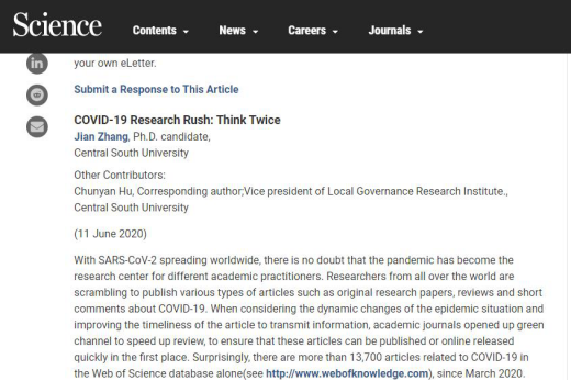 2020年6月11日,英国正版365官方网站公共管理系胡春艳教授与2019级博士生张建在国际顶级自然科学期刊杂志《Science》(《科学》)eletters栏目,在线合作发表《COVID-19 Research Rush: Think Twice》一文。