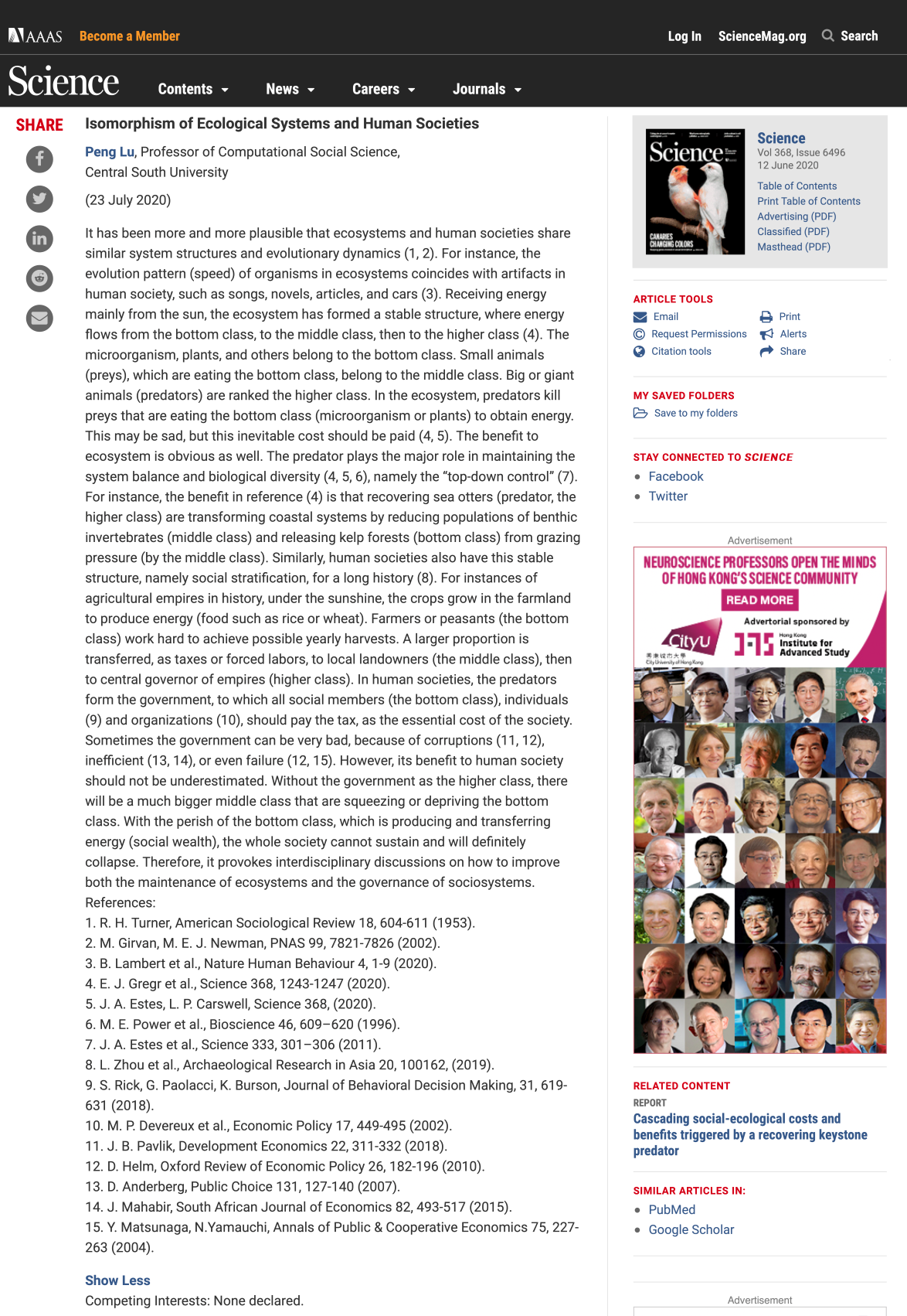 英国正版365官方网站社会学系吕鹏教授近期在《Science》杂志在线发表eLetter文章《Isomorphism of Ecological Systems and Human Societies》,针对Science两篇近期文章进行点评,阐述生态系统演化与社会系统治理观点。第一篇是Gregr等人的研究论文《Cascading social-ecological costs and benefits triggered by a recovering keystone predator》。发现大西洋沿岸某生态系统中,由于海獭(sea otters)增加,导致被捕食者benthic invertebrates数量被控制,从而促进了kelp forests等底端生物的生长。整个生态系统由于海獭的存在,变得更加优化与多样性,以较大幅度37%增加了生物数量(biomass)。取得了正面的总体系统性经济收益。第二篇是Estes & Carswell的评议文章《Costs and benefits of living with predators》,从生态学-经济学等进行点评,就具体测算、模型问题等进行讨论与评议。吕鹏教授从社会生态系统与社会仿生学角度阐述观点,认为人类社会有机体系统也存在类似拓扑结构即社会阶层结构。如果存在一个治理有方的强有力政府,将会在很大程度上优化社会治理,提升全社会福祉,促进最大公约数的提升(此次疫情中已经得到体现)。相关观点为社会系统论、计算社会学、社会物理学、社会仿生学、历史社会学等研究奠定数学理论与拓扑模型基础,为“放水养鱼”、新业态培育、简政放权、做强小微企业、激发市场活力等公共政策提供系统性参照与导向。
